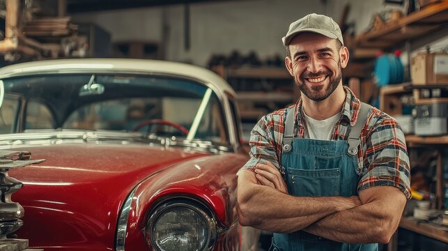 Smiling mechanic in workshop with classic car, showcasing craftsmanship and passion for automotive restoration.