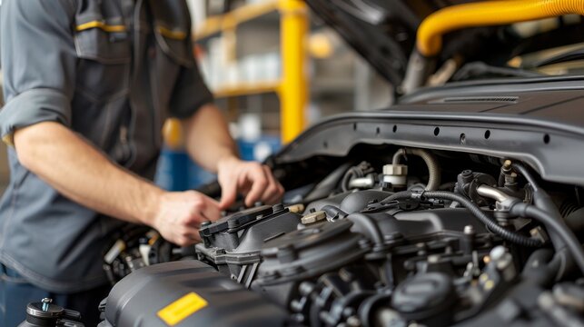 Auto mechanic working on engine garage action photography indoor setting close-up view automotive repair concept