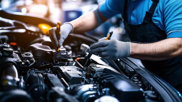 Car mechanic repairing engine with screwdriver wearing gloves and uniform close up of hands working vehicle maintenance workshop bright lighting detailed engine parts and components professional auto
