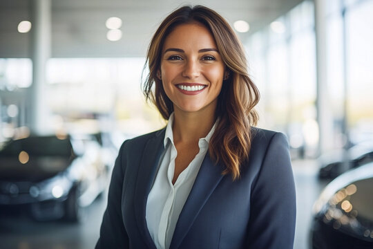 A smiling woman in business attire stands in a car dealership, ideal for promotional materials or corporate events in the automotive industry.