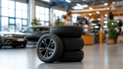 In a bright and spacious automotive service center, four brand-new tires are neatly stacked indoors, showcasing their pristine condition during the daytime