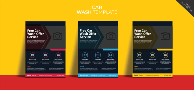 Mobile car wash detailing catalog flyer and banner template set. Auto cleaning promotional design with pricing, service packages, and contact details for car wash businesses and advertising.
