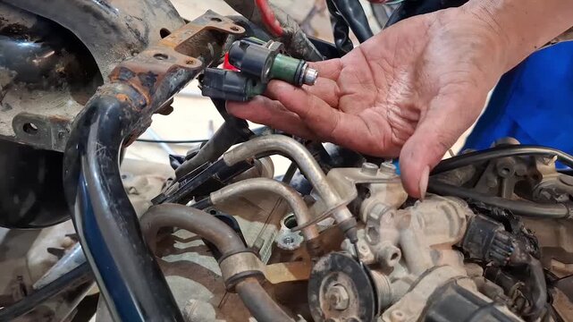 Close-up footage of a student mechanic performing a motorcycle engine inspection during practical training in an automotive workshop.