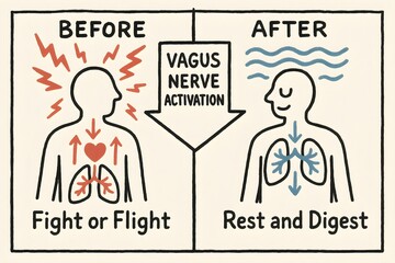 Illustration of vagus nerve activation transitioning from stress to calm.