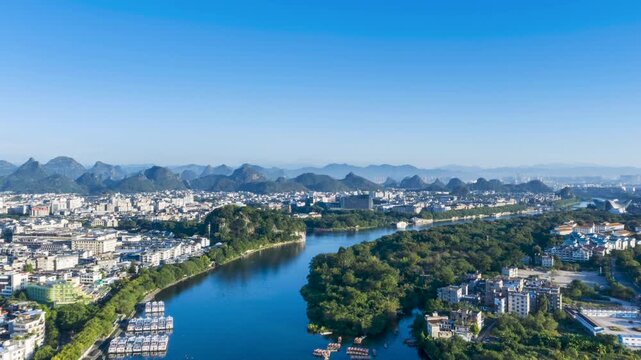 Aerial time-lapse of Li River and Elephant Trunk Hill at early morning, serene karst landscapes and iconic city scenery in Guilin, Guangxi Zhuang Autonomous Region, China