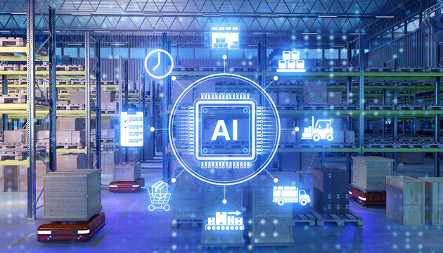 Smart warehouse with autonomous robots and AI logistics icons managing cargo, concept of automation, supply chain, artificial intelligence. Logistics, Artificial Intelligence, Automation.