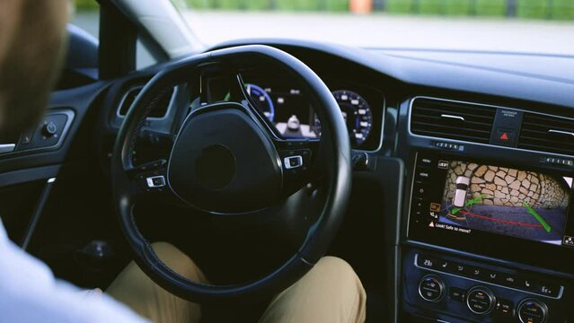 Self Driving Autopilot Autonomous Cars. Male driver parking electric car which is driven automatically. Man driving in innovative automated car using self-parking autopilot for parking on parking lot.