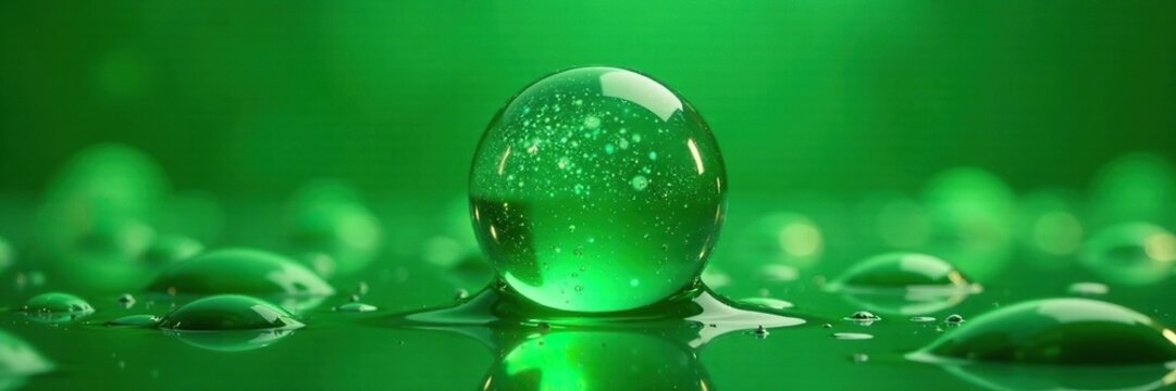 Shimmering green liquid fills a mirrored sphere, futuristic, green