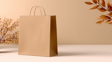 A neutral-toned paper shopping bag positioned elegantly on a smooth surface with autumn foliage