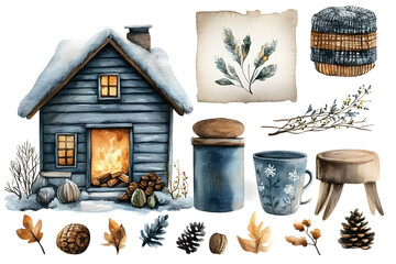 Cute watercolor illustration of autumn and winter hygge elements collection isolated on white background