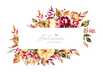 Frame Watercolor floral boho. Autumn flora. Bouquet of autumn flowers. Roses, peonies, leaves, buds. Vintage wedding bouquet. Watercolor botanical illustration. Sketch. Wedding invitation, card
