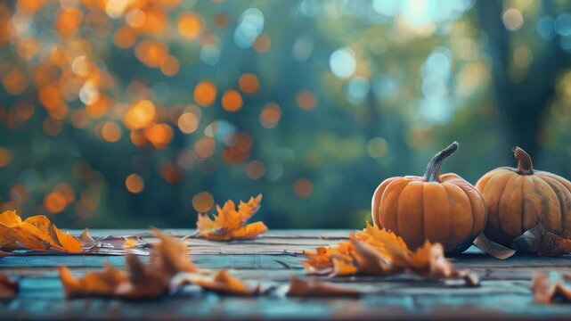 features the serene beauty of autumn, showcasing pumpkins, fallen leaves, sunlit forest. Perfect for celebrating Halloween, Thanksgiving Day, the harvest season, and the enchanting autumn ambiance