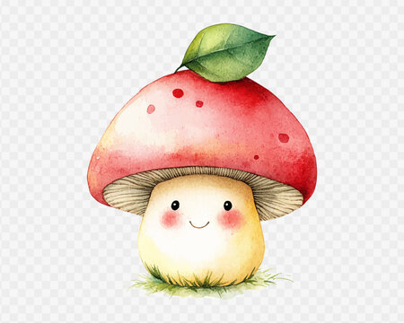 Watercolor cute mushroom character with red cap, blush cheeks and leafy details, perfect for whimsical woodland decor and autumn kids designs. Vector illustration.