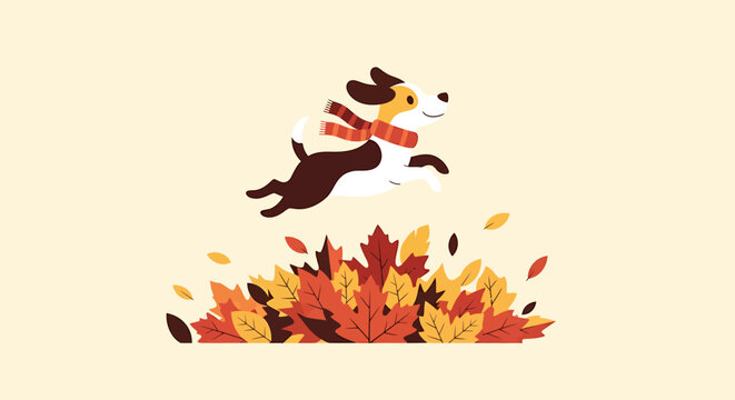 Happy dog jumping into a pile of autumn leaves, flat lay illustration with warm colors against a beige background.