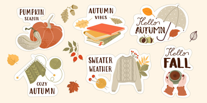 A collection of cute stickers dedicated to autumn. Pumpkins, warm sweaters, books, fallen leaves and cozy drinks - all this is represented in this colorful sticker set.