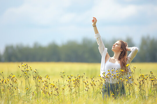 autumn field girl health / beautiful young model, landscape in a summer field, cute happy model