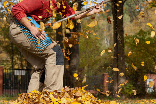 Man in his hands with a fan-shaped yellow rake collects fallen autumn leaves in the park. A rake and a pile of leaves on the lawn. Autumn cleanliness in the garden yard.