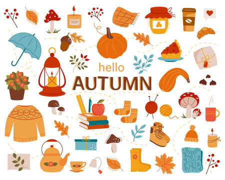 Hello Autumn. Set with pumpkin, fruit, cute wellies boots, books and autumn leaves. Collection of elements for autumn coziness. Vector illustration