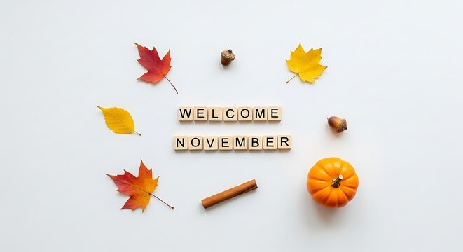 Autumnal welcome message with seasonal elements and copy space on white background