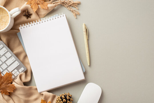 Warm autumn scene with a cup of coffee on a desk, surrounded by pumpkins, planner, and laptop near a window. Perfect cozy workspace with seasonal fall decor.
