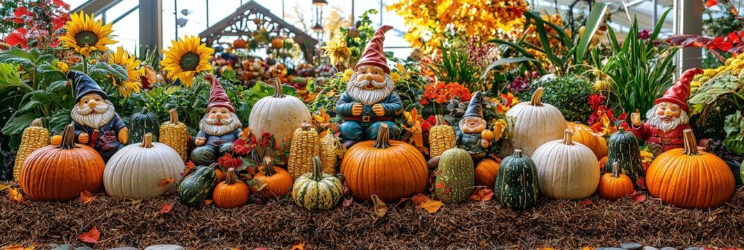 Gnomes gather around a variety of pumpkins in a lively garden adorned with sunflowers and autumn leaves
