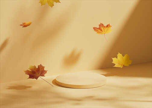 3D pedestal podium, autumn yellow background.  Leaves falling with sun shadow. Fall display, showcase. Beauty product promotion or text. Abstract mockup with leaf.  Nature 3D render illustration