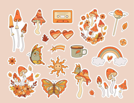 Set of 70s autumn vibe stickers. Retro mushroom, rainbow, glass, butterfly, sun, flowers in hippy style. Vintage psychedelic groovy vector illustration.