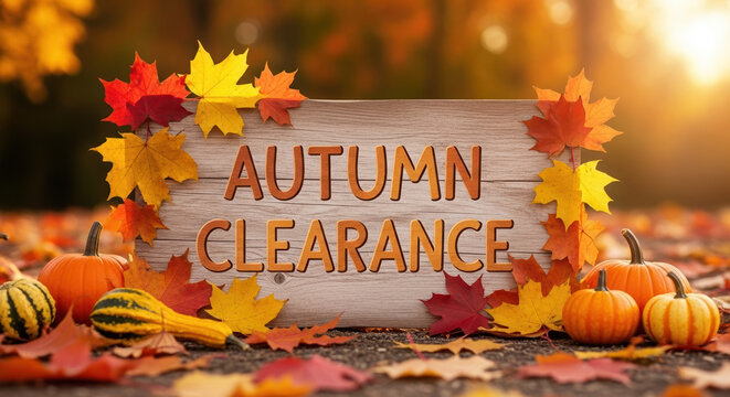 Autumn sale announcement on wooden sign with colorful fall leaves and pumpkins. Autumn sale seasonal promotion with festive autumnal decorations for retail business.