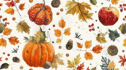Watercolor Illustration of Autumnal Elements with Pumpkins, Apples, and Leaves