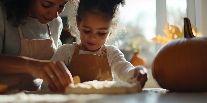 A charming autumnal moment of a mother and her young daughter baking a homemade apple pie in a rustic farmhouse kitchen