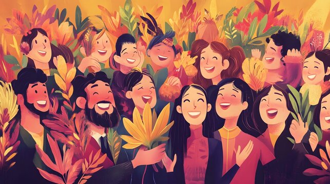 Happy thanksgiving gathering featuring delicious seasonal food and autumn decorations celebrating family and togetherness