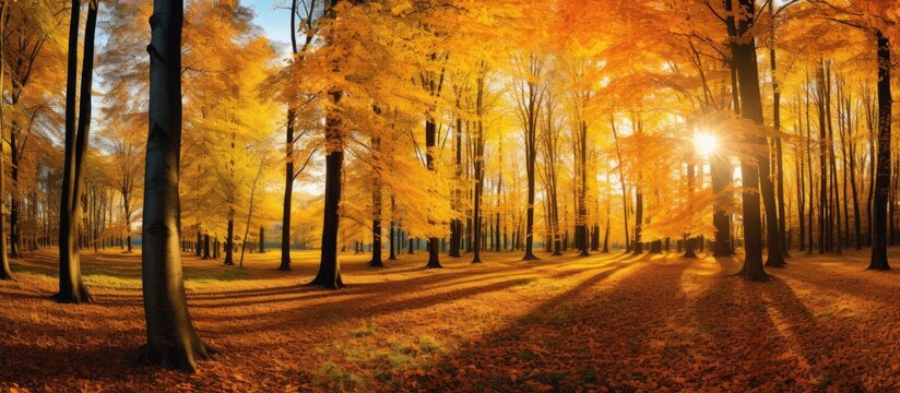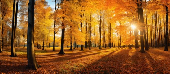 Tranquil autumnal forest panorama with vibrant colors, offering a serene and magnificent outdoor setting, perfect for a copy space image.
