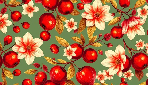 Seamless autumnal pattern featuring red and white fruits and flowers in a vintage style, poppies, autumn