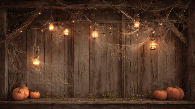 Rustic Halloween wooden background with pumpkins lanterns cobwebs and spooky lights