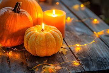 Various pumpkins in orange and white on a blue wooden surface, with candles and decorative items, creating a festive fall or Halloween ambiance.