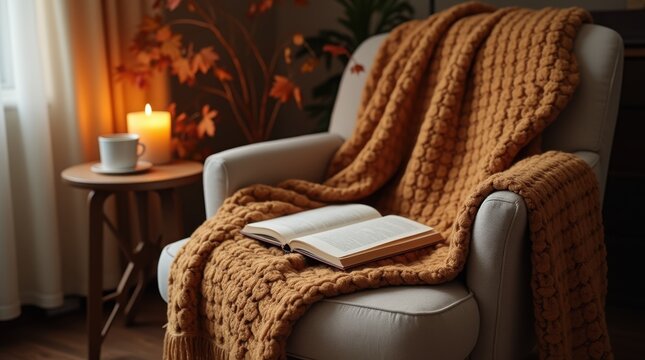 Inviting autumn reading nook featuring a soft blanket on a chair, lit candle, open notebook and steaming cup of tea, bathed in warm natural light.