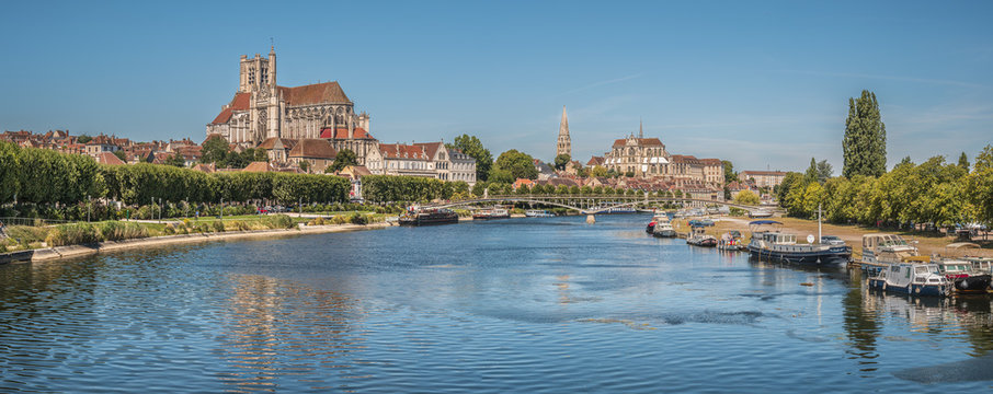 Panorama of the Yonne river and the church of Auxerre in Burgundy, France