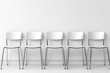 Five empty white chairs against a minimal white wall in a waiting room