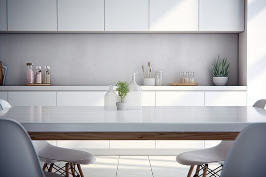A contemporary, highend white kitchen table adorned with decorations and available space to showcase your products. This can be superimposed onto a blurred, modern kitchen background. Created with