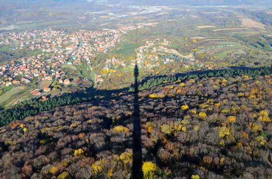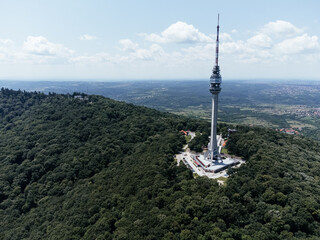 Aerial of the Avala tower in the middle of a green hill in Beli Potok, Serbia.