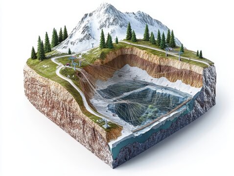 3D cutaway of mountain slope with avalanche control tech, showing snow nets, dynamic barriers, vegetation anchoring, and layered terrain analysis, clean white background