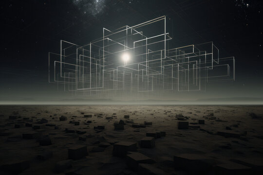 Abstract art installation in black and white. Surreal, monotonous, apocalyptic, futurism.
