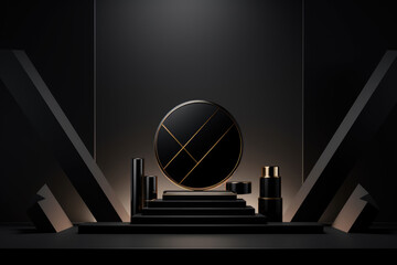 Cosmetics arranged on a geometric, monochrome stage with striking angular lines