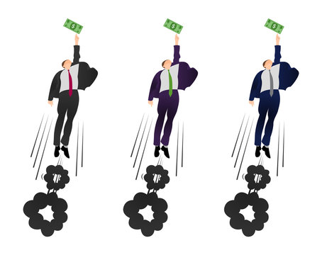 Illustration of  vector flat businessman trying to get a dollar. Being motivated by money. Earning much more money. Pursuit of money.  Trying to earn.
