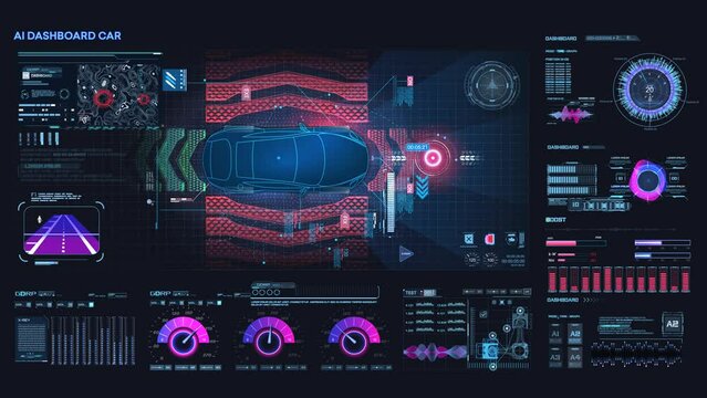 Accident prevention system. Autonomous vehicle movement. Help the driver while driving. Top view of a self-driving CAR on the road. Futuristic user interface HUD, FUI. Hologram, copy space.