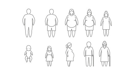 Human Life Stages and Body Mass Index Line Icons Set. Overweight, Normal Weight, Pregnant, Child, and Elderly People Vector Illustration