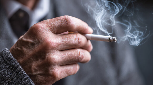 Close-up of Man's Hand Holding a Smoking Cigarette with Smoke Swirling in Air