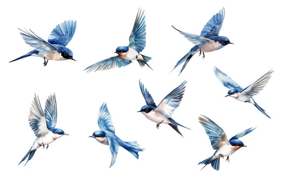 Set of watercolor swallows png.Swallows flying in the air with blue and white feathers and tail.Swallow or Martin passerine bird with long tail and pointed wings flying and gliding vector set.