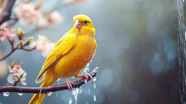 Beautiful little yellow bird sitting on a twig on a rainy day, a wet yellow bird shakes itself off from the water close up