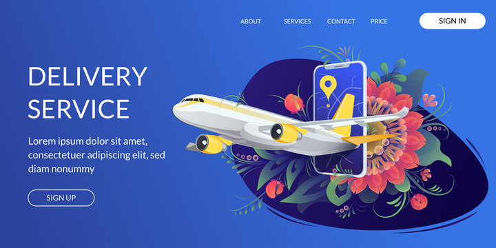 Web page design template for project delivery, transport, airplane. Modern vector illustration concepts.